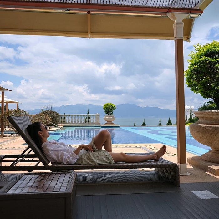 To complete the look, you can place a marble bathroom set (repurposed as a chic outdoor tray set) on a side table for holding towels, sunscreens, and refreshing drinks. It’s an elegant way to mix functionality with design.